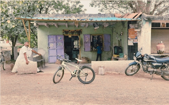 of the Mukhya of the village. The women of the village were all huddled up, with the DadiBaa / Maa of the village seated on the jhoola. She was seated in a traditional gamthi way with both legs at a 90 degree angle, on rests on the wooden jhoola, other folded upright and her hand on the upright leg. The ladies crowded the floor, making garlands and samagri for the pratah kaal pooja.