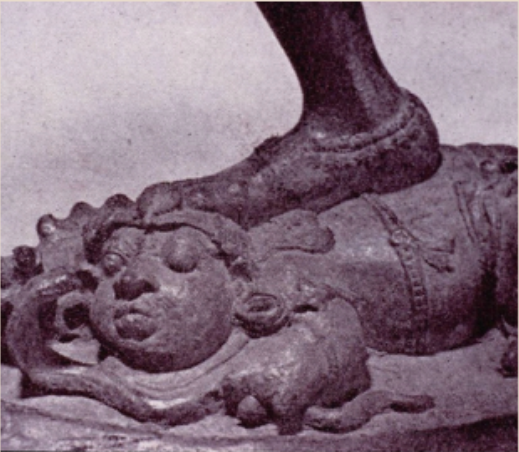“So pleased with the Stuti and pleas, Mahadev had to be ingenious in his way of defeating this demon. He broke into one of the fierce forms of tandav and crushed Apasmara under his right foot and has kept him fixed there ever since.